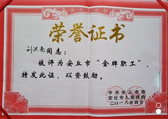 2018年4月28日下午,安丘市慶?!拔逡弧眹H勞動節(jié)暨勞動模范金牌員工表彰大會在市政府會議室舉行。會上,安丘博陽機械車間車床班班長趙秀文同志被授予“安丘市勞動模范”榮譽稱號,電氣部部長劉洪亮同志被授予獲“安丘市金牌職工”榮譽稱號,電氣部部長劉洪亮同志、設(shè)計一部部長劉玉平同志、設(shè)計二部部長高樹平同志分別被授予“安丘市能工巧匠”榮譽稱號。榮譽的獲得,展示了博陽人開拓創(chuàng)新、扎實苦干、自強不息、甘于奉獻的精神風(fēng)貌。